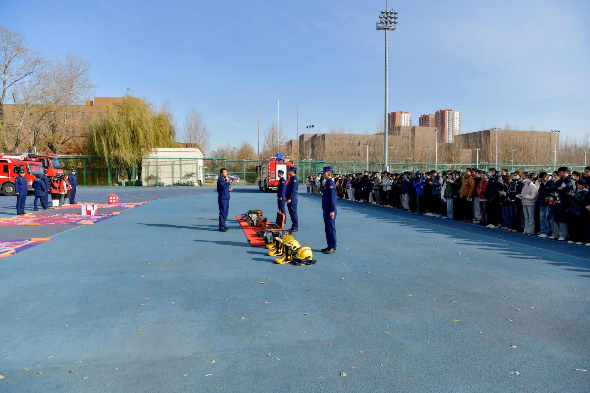 11月7日,在第34个全国消防日(2025年11月9日)来临之际,学校在校园东区体育场举办119消防宣传月主题活动。吉林市船营区消防救援大队副大队长高翱出席活动,全校1000余名学生参加了本次活动。